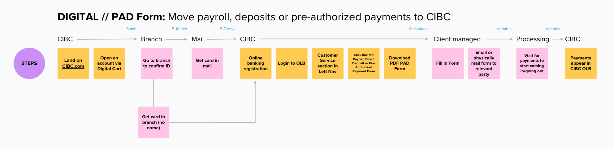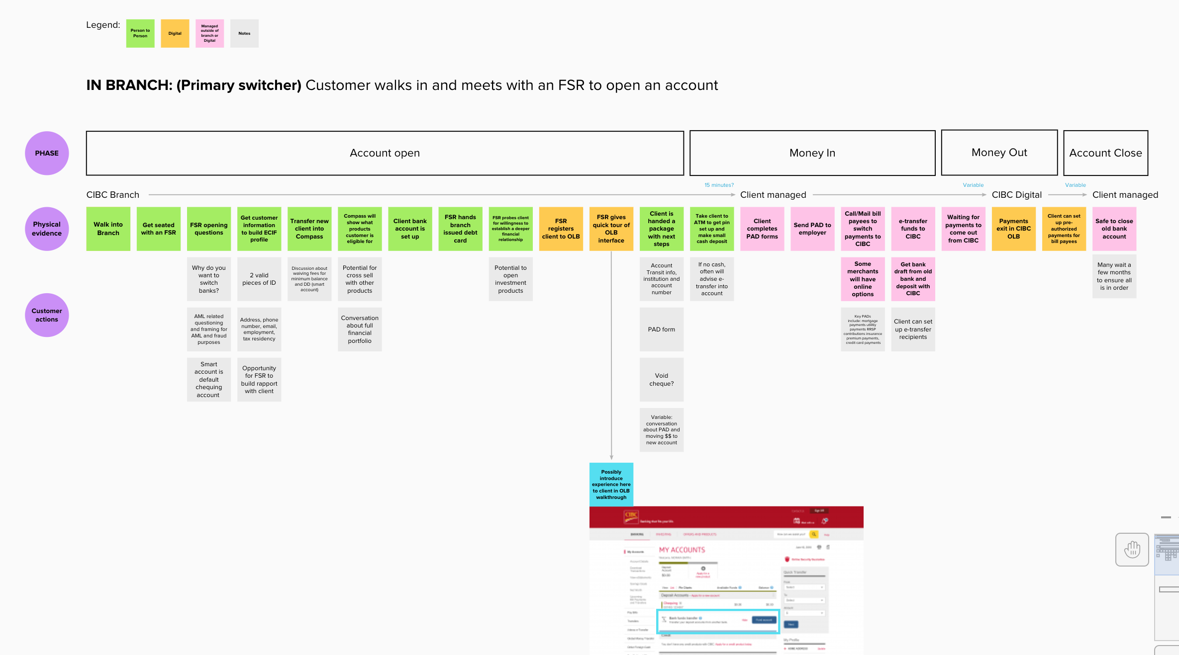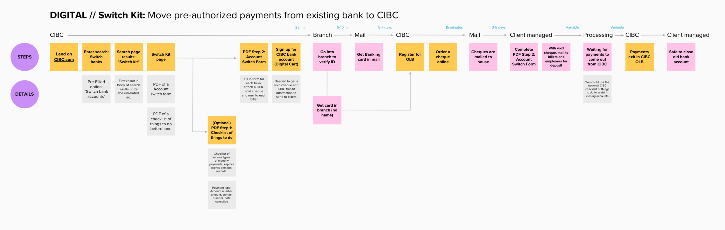 There are many incentives to change banks, typically an attractive product offering, lower fees or superior service. Today at CIBC, switching banks can be facilitated in some capacity by an advisor in branch, but alot of work is required of the client to do on their own time and it can be difficult determine if you’ve done enough to setup your new account. We partnered with the deposits team to explore ways to provide primary bank switchers with a toolkit that enables them to switch their savings over to CIBC in a methodical and guided way.