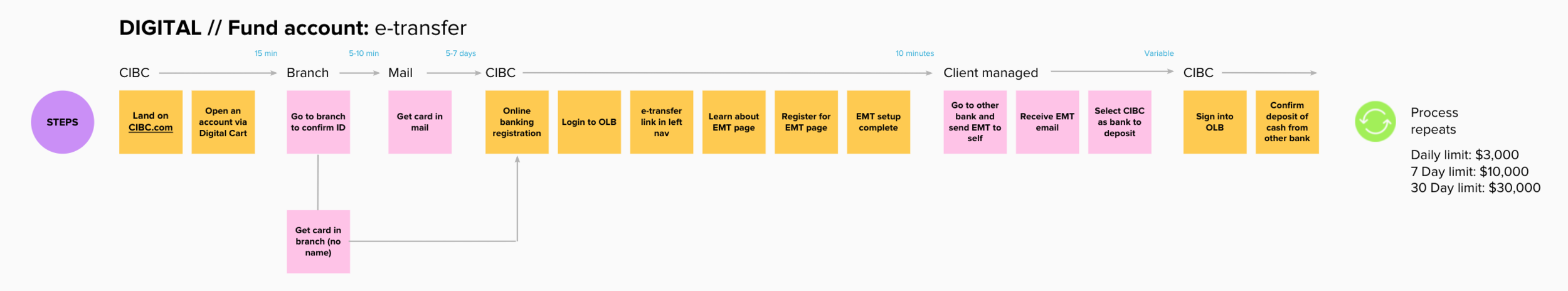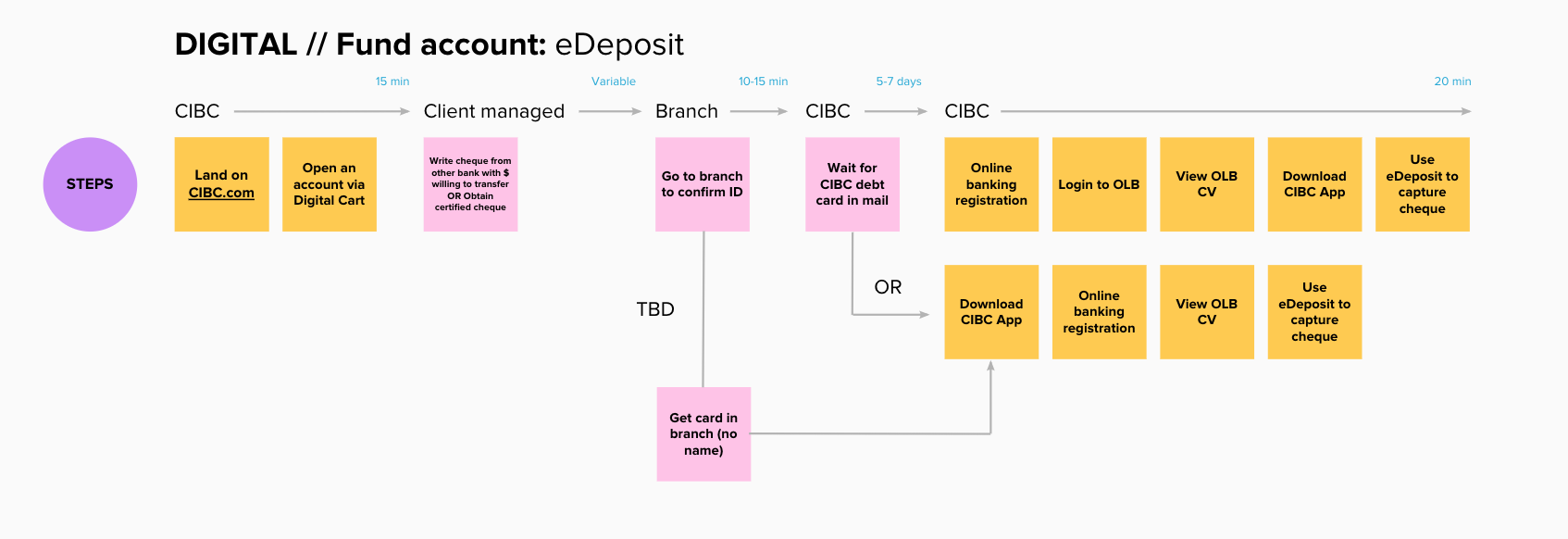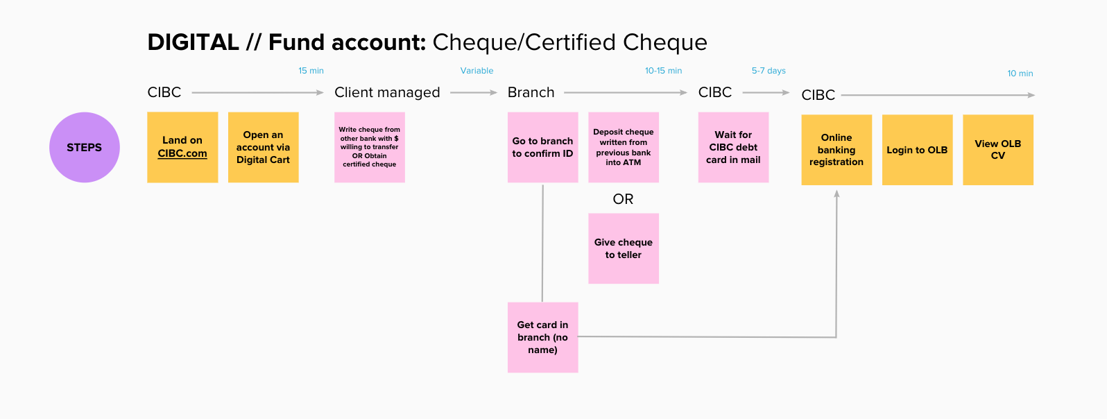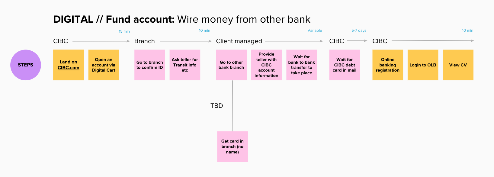 There are many incentives to change banks, typically an attractive product offering, lower fees or superior service. Today at CIBC, switching banks can be facilitated in some capacity by an advisor in branch, but alot of work is required of the client to do on their own time and it can be difficult determine if you’ve done enough to setup your new account. We partnered with the deposits team to explore ways to provide primary bank switchers with a toolkit that enables them to switch their savings over to CIBC in a methodical and guided way.